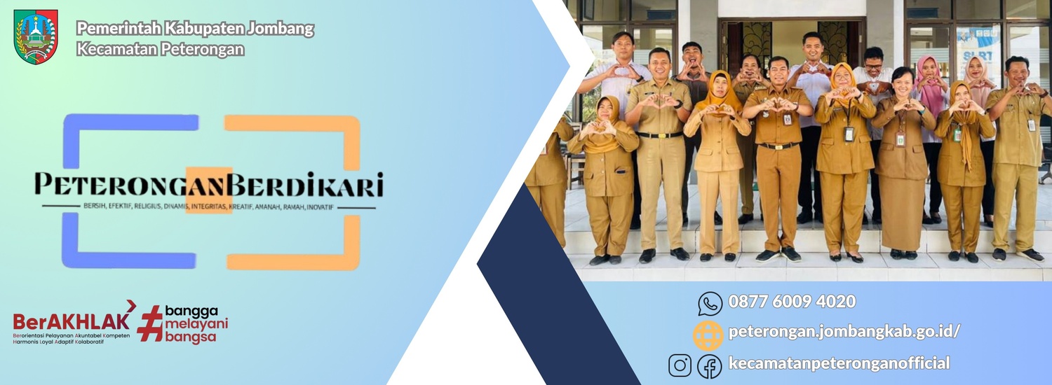 Assalamu’alaikum WR.WB Alhamdu lillahi rabbil ‘alamin, dengan mengucapkan puji dan syukur kehadirat Allah SWT serta berkat rahmat dan hidayahnya sehingga kita memperoleh kenikmatan yang tiada tara yaitu nikmat iman dan nikmat Islam serta juga nikmat kesehatan dan kesempatan sehingga bisa menikmati kehidupan sampai dengan saat ini. Shalawat dan salam tak lupa pula untuk tetap saling kita sanjung sajikan ke baginda Rasulullah Muhammad SAW beserta keluarga dan sahabat beliau sekalian. Peluncuran website ini bertujuan untuk mempublikasikan informasi dan dokumentasi Kecamatan Peterongan khususnya tentang pelayanan publik, pemerintahan dan pembangunan. Oleh karena itu dengan memanfaatkan sarana teknologi informasi yang ada dan sebagai bentuk pelayanan melalui keterbukaan informasi publik kepada masyarakat, Website Kecamatan Peterongan hadir sebagai penyampai informasi serta pelayanan publik yang kini sudah dapat di akses melalui internet, kami berusaha mewujudkan hal tersebut semaksimal mungkin. Semoga dengan adanya website ini dapat membantu dan bermanfaat, terutama informasi yang berhubungan dengan pemerintahan dan pembangunan Kecamatan Peterongan khususnya. Besar harapan kami, sarana ini dapat memberi manfaat bagi semua pihak yang ada di lingkup Kab. Jombang khususnya Peterongan. Tentunya kami menyadari bahwa website yang kami sajikan ini jauh dari kesempurnaan, baik itu dari segi tampilan ataupun dari segi penyajian informasi dan lain sebagainya tentu belum bisa memuaskan semua pihak, untuk itu kami mohon masukan, saran dan kritikan yang membangun demi terpenuhi kesempurnaan Website Kecamatan Peterongan yang kami sajikan ini serta agar kami bisa terus belajar dan meng-update diri, sehingga tampilan, isi dan mutu website yang kami sajikan ini akan terus berkembang dan lebih baik nantinya. Terimakasih. Wassalamu'alaikum WR.WB
