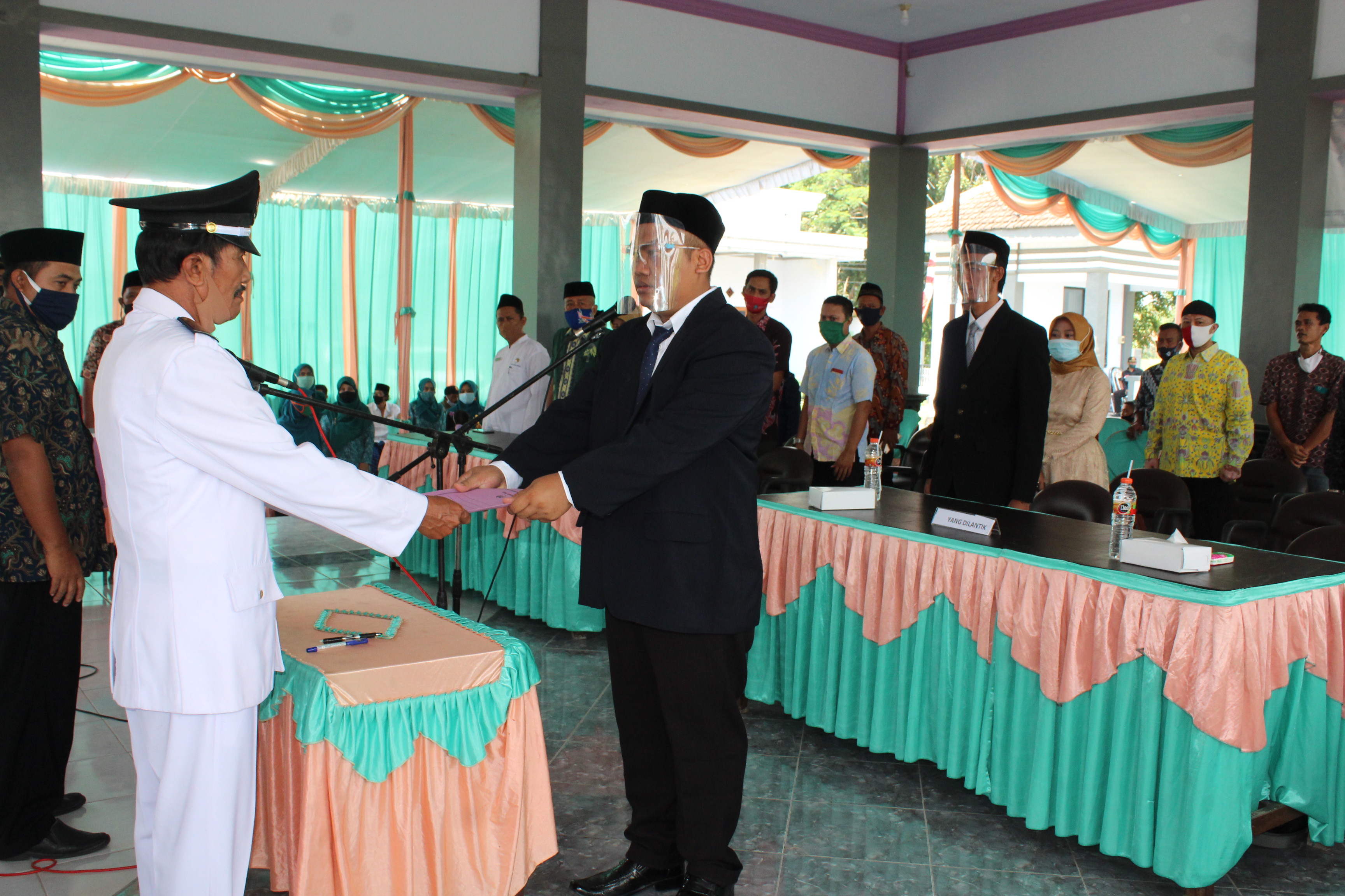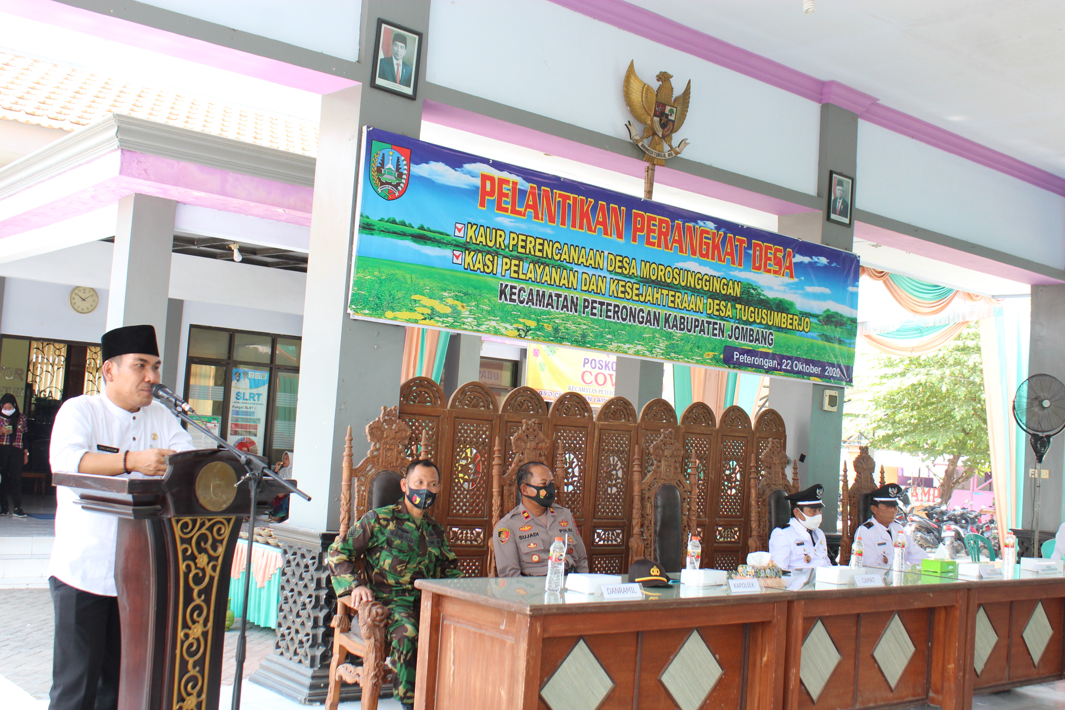 Kamis (22/10/2020), Camat Peterongan Shollahuddin, SH, M.Si bersama MUSPIKA Kecamatan Peterongan menghadiri pelantikan perangkat desa . Bertempat di Pendopo Kecamatan Peterongan pelantikan perangkat desa ini dilakukan dari dua desa yaitu Desa Tugusumberjo dan Desa Morosunggingan. Pelantikan dimulai dari Desa Morosunggingan, Kepala Desa Morosunggingan Sunaryo melantik Kaur Perencanaan yaitu Andik Kurniawan Spd. Dilanjutkan dengan Kepala Desa Tugusumberjo As’ad yang melantik Magfur Susilo Budiantoro sebagai Kasi Pelayanan dan Kesejahteraan. Sementara ditempat yang berbeda itu pada Rabu (21/10/2020) Kepala Desa Kebontemu Sirojul Munir juga melantik tiga perangkat desa baru yaitu Ali Hendra Veryanto Spd sebagai Kepala dusun Kabunan, Adi Hermawan S. Sos sebagai Kaur Perencanaan, Fatra Harmansah Prabowo S. Pt sebagai Kaur Pemerintahan. Dalam sambutannya Camat Peterongan Shollahuddin, SH, M.Si menegaskan dan berpesan kepada semua perangkat desa yang baru agar menjaga loyalitas serta profesional kerja tidak membeda-bedakan siapapun yang menjadi kepala desanya karena profesionalitas kerja dapat mempengaruhi kinerja pelayanan kepada masyarakat di desa.(admin/ptr)