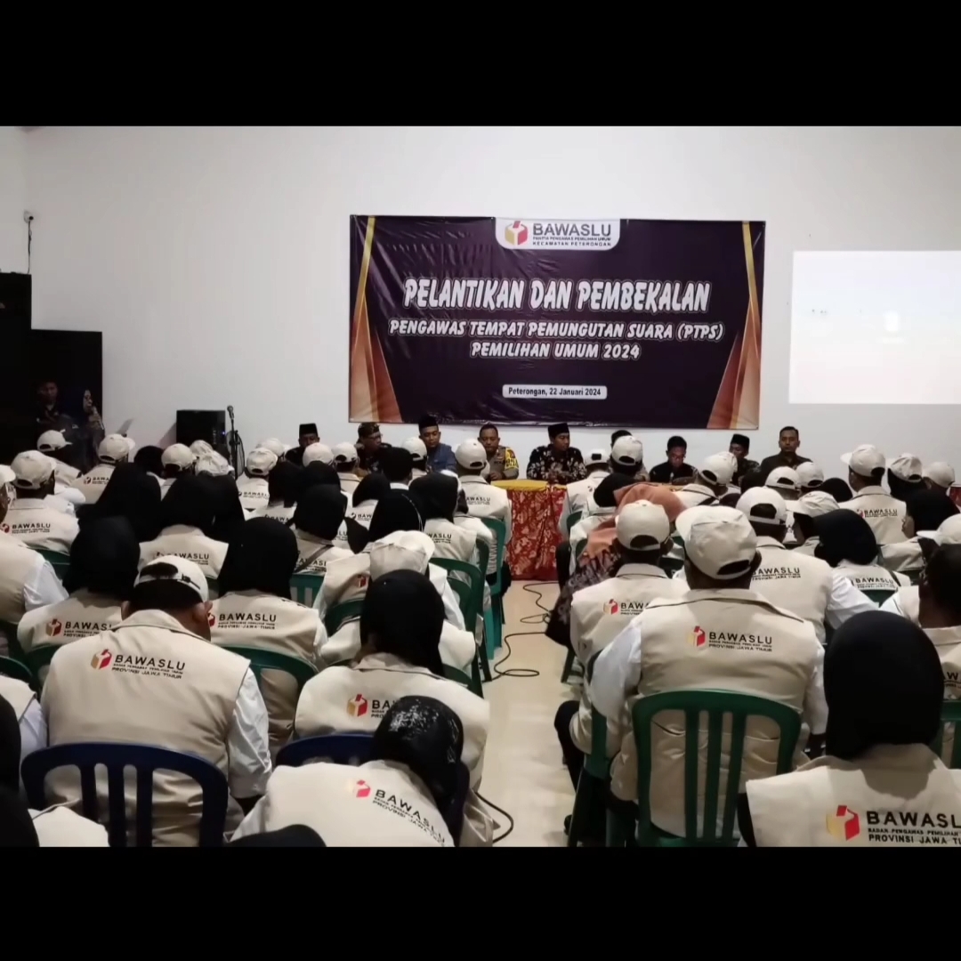 Camat Peterongan M. Eryk Arif, S.STP,. M.M bersama Komisioner Bawaslu kabupaten Jombang Farwis, S.Sos, Komisioner Panwaslu Kecamatan Peterongan, Forkopimcam, Kapala Desa Senden dan Pengawas kelurahan/desa se - Kecamatan Peterongan menghadiri Pelantikan dan Pengambilan Sumpah/Janji Pengawas Tempat Pemungutan Suara (PTPS) Kecamatan Peterongan Tahun 2024 di Gedung Serbaguna Balai Desa Senden.