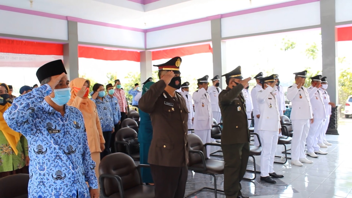 Senin (17/08/2020), Camat Peterongan Shollahuddin, SH, M.Si. bersama Forum Komunikasi Pimpinan Kecamatan Peterongan mengikuti Video Conference Upacara Peringatan HUT ke-75 RI serentak Bersama jajaran Pemerintah Daerah Kabupaten Jombang lainya di Kantor Kecamatan Peterongan, Senin, 17 Agustus 2020. Hadir Danramil 0814/13 Peterongan Kodim jombang Kapten Inf Kartiko EB Kapolsek Iptu Sujadi S. Sos dan beserta 14 Kepala Desa se-Kecamatan Peterongan. Upacara 17 Agustus dengan Inspektur Upacara Presiden RI Ir. H. Joko Widodo berlangsung di Istana Negara, Jakarta, Senin 17 Agustus 2020. Dalam upacara itu tampak Presiden Jokowi memakai baju adat Timor Tengah Selatan dari Nusa Tenggara Timur. Sore harinya upacara penurunan bendera pun dilakukan dengan Video Conference namun berbeda dengan pagi harinya peserta yang hadir yaitu Sekretaris Desa bergantian dengan Kepala Desa. Tepat Pukul 16.30 upacara penurunan bendera dimulai dengan Inspektur Upacara Presiden RI Ir. H. Joko Widodo. Seluruh yang hadir mengikuti upacara dengan hidmat dan saksama meskipun via virtual. Kegiatan upacara melalui Video Conference kali ini di akhiri oleh doa dari Kepala KUA Kecamatan Peterongan Abdul Ghofur. Untuk pertama kalinya sepanjang sejarah, perayaan Hari Kemerdekaan RI dilakukan secara virtual lantaran adanya pandemi COVID-19.Upacara dilaksanakan dengan menerapkan Protokol Kesehatan dengan memakai masker dan menjaga jarak. (admin/ptr)